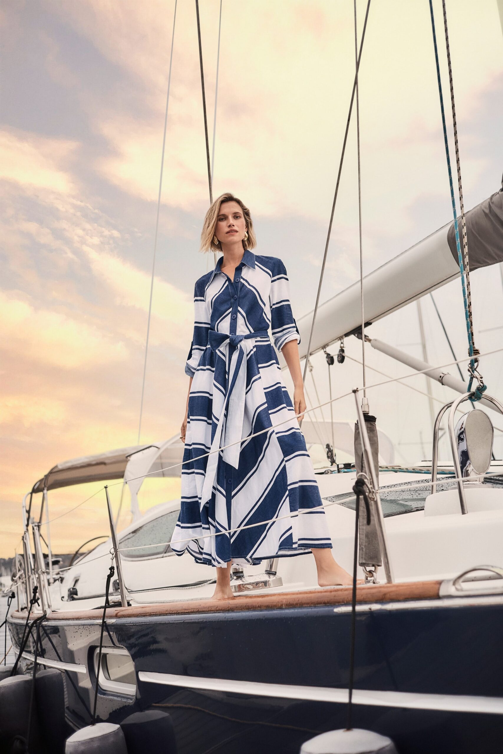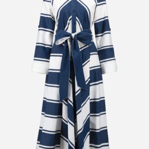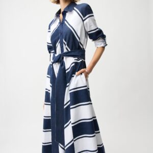 This stripe cotton shirt dress features a classic shirt collar and front placket with buttons. Three-quarter sleeves with tabs and a reversible solid sash at the waist add versatility. while the midi length completes the look.