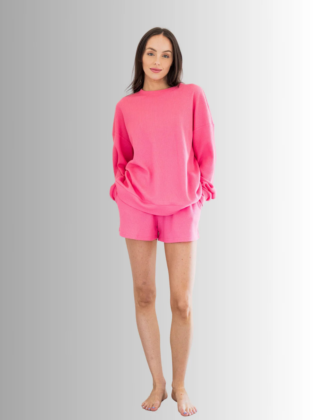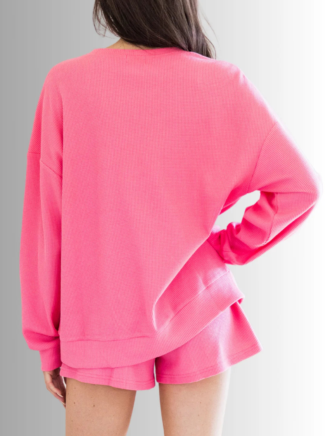 "Get cozy and cute with our Everyday Waffle Short Set! This 2pc cotton short set features long sleeves for added comfort. Perfect for lounging or running errands. this set is a must-have for everyday wear."