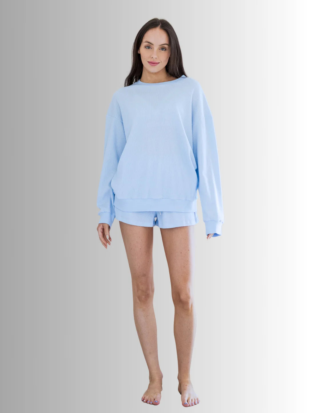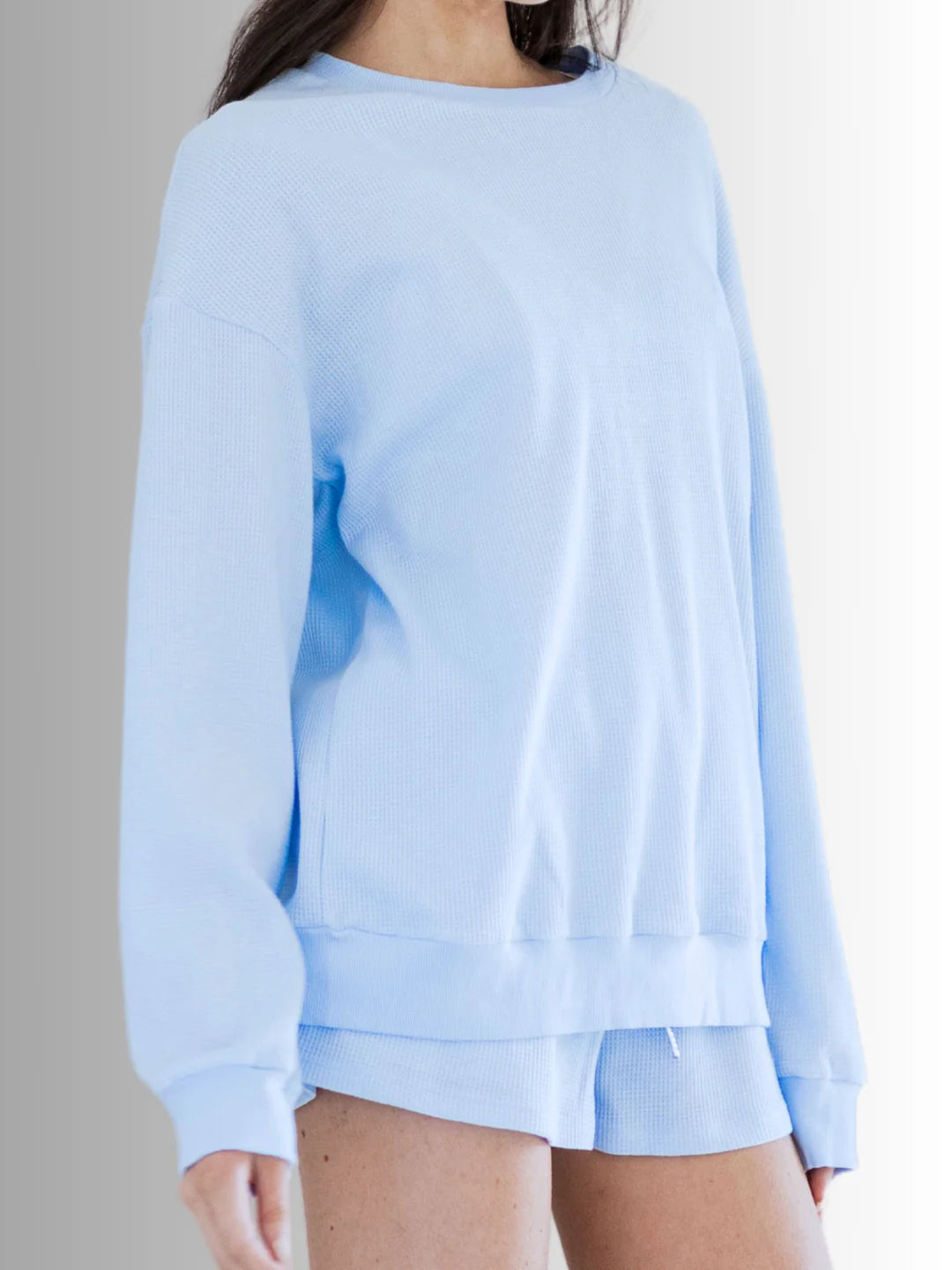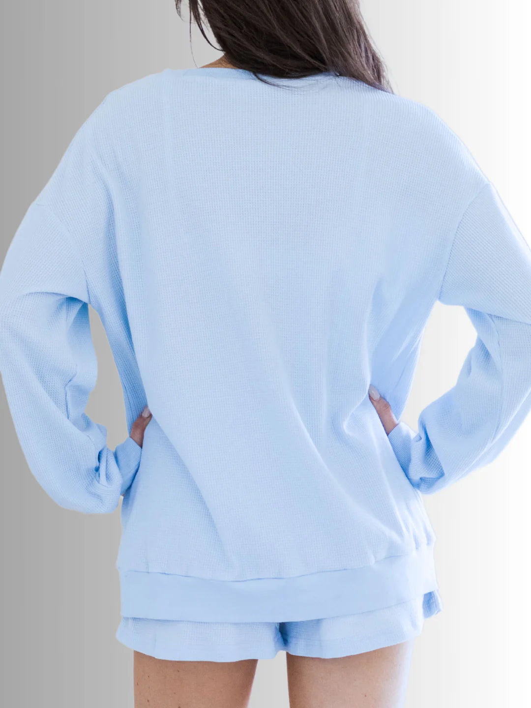 "Get cozy and cute with our Everyday Waffle Short Set! This 2pc cotton short set features long sleeves for added comfort. Perfect for lounging or running errands. this set is a must-have for everyday wear."