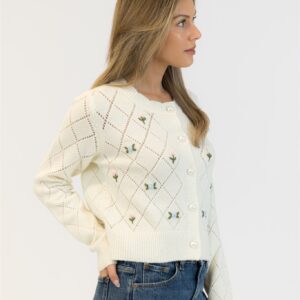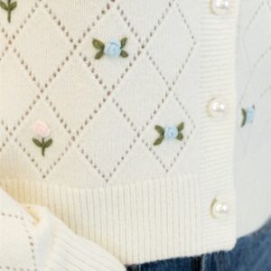 This eco-friendly cardigan features beautifully embroidered roses. adding a delicate and romantic touch to your look. The soft. comfortable fabric makes it a perfect addition to both casual and semi-formal outfits. while the rose embroidery enhances its unique and feminine style.