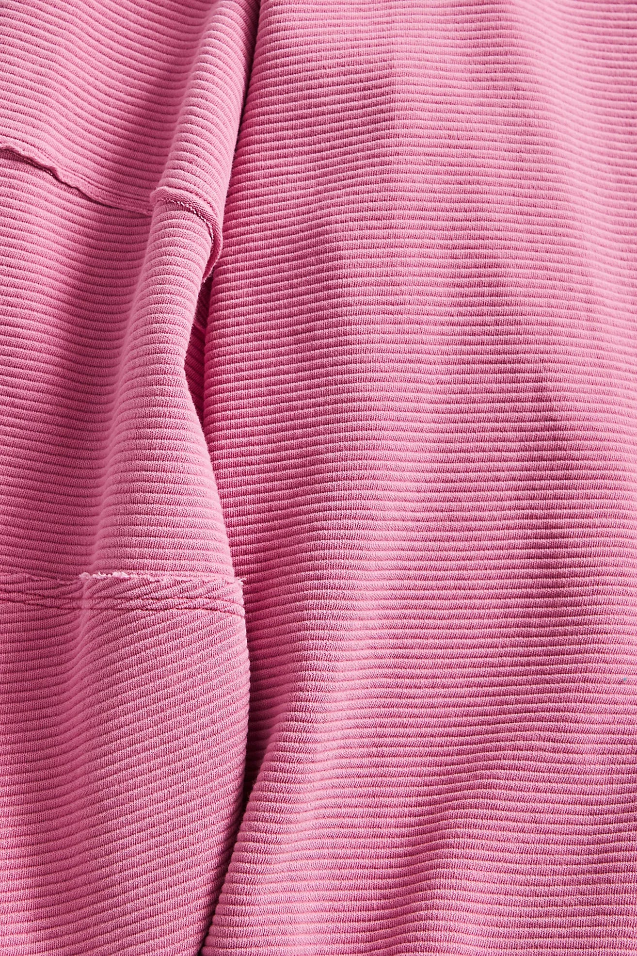 Features: Ribbed fabrication. scoop-neckline. drop-shoulder sleeves with cuffs. defined seam detailing with raw trim